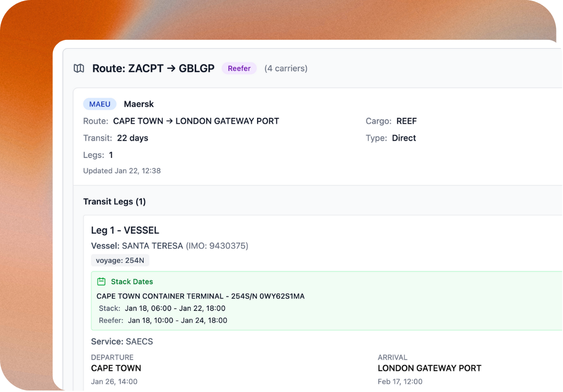 Virifides Vessel Schedules + Stack Dates data is available via the Virifides portal, directly via API and via our integration partners.